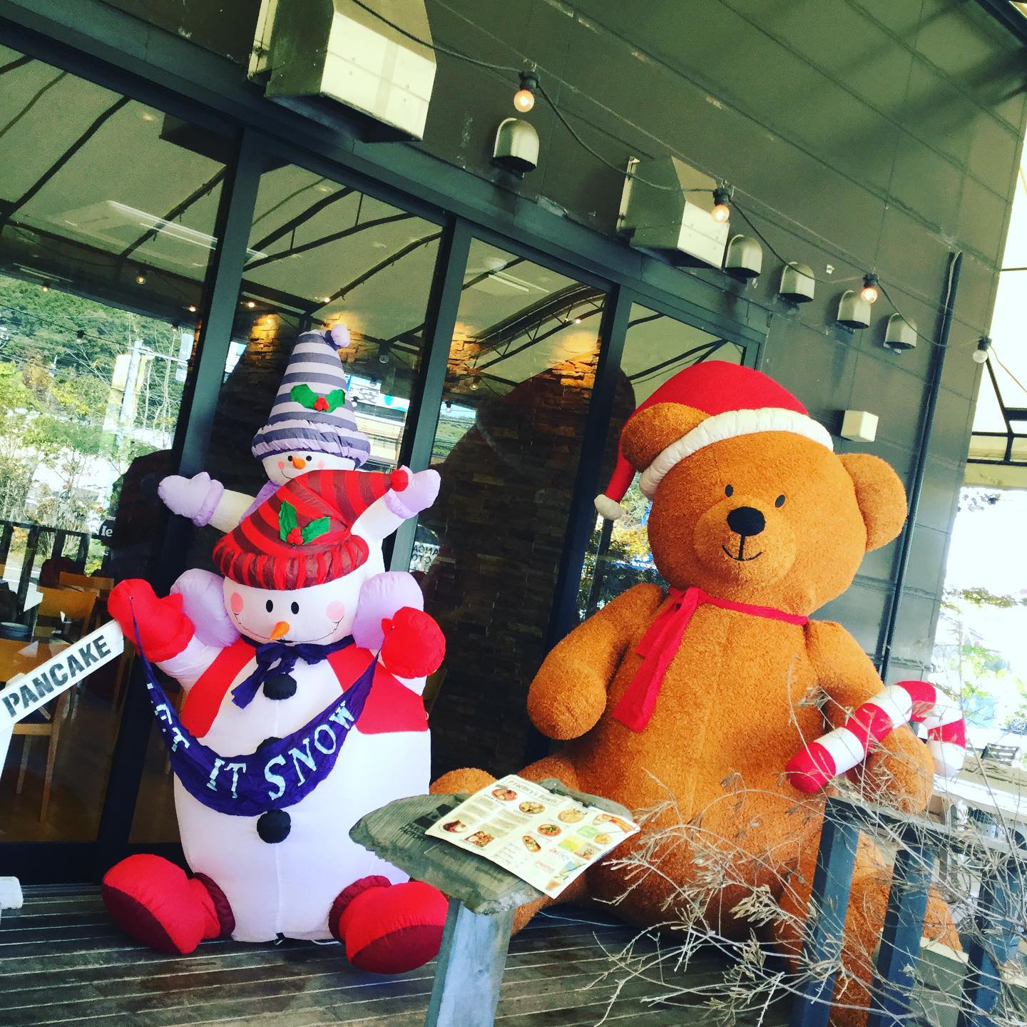 お店の外に大きなクマさん?と雪だるまさん☃️が居ますよ